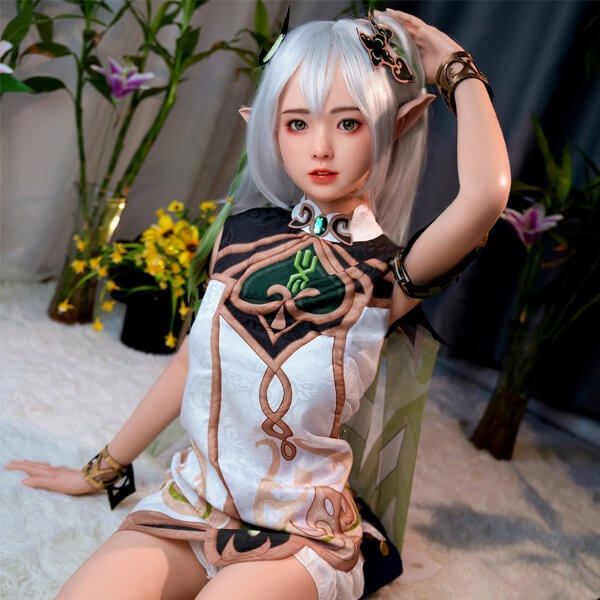 Búp bê tình dục Nahida mang phong cách fantasy với đôi tai nhọn đặc trưng của elf, mái tóc bạc mềm mại, và đôi mắt lớn, long lanh tạo cảm giác sống động, chân thực.